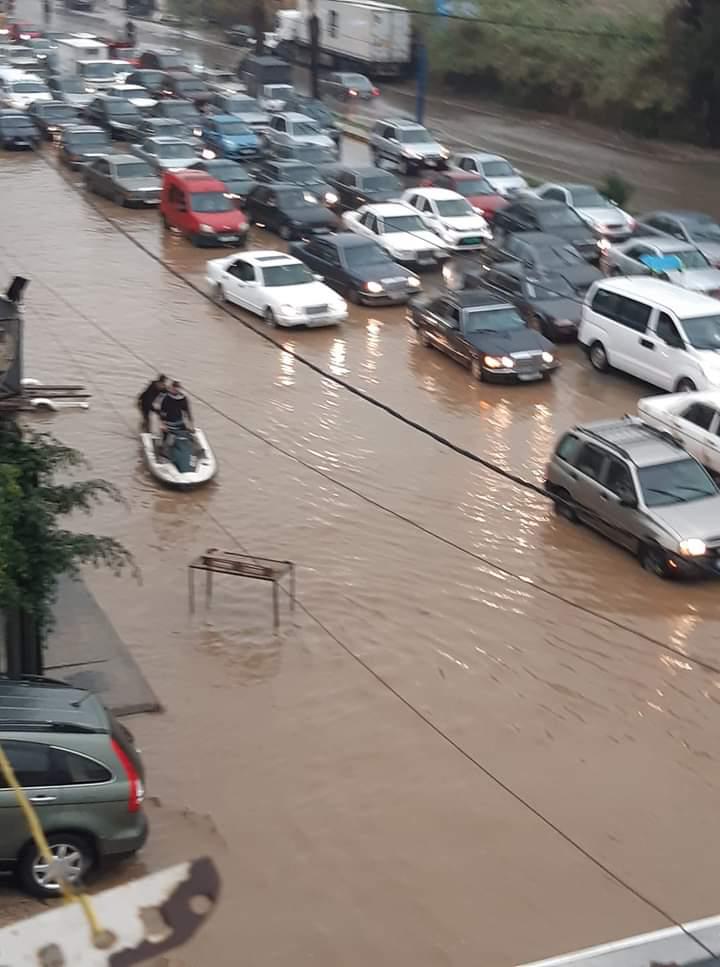 وبينت بعض الصور كيف غرق أوتوستراد البداوي بالمياه، حتى وصل الأمر أن يستخدم أحد المواطنين مركباً صغيراً للتنقل.